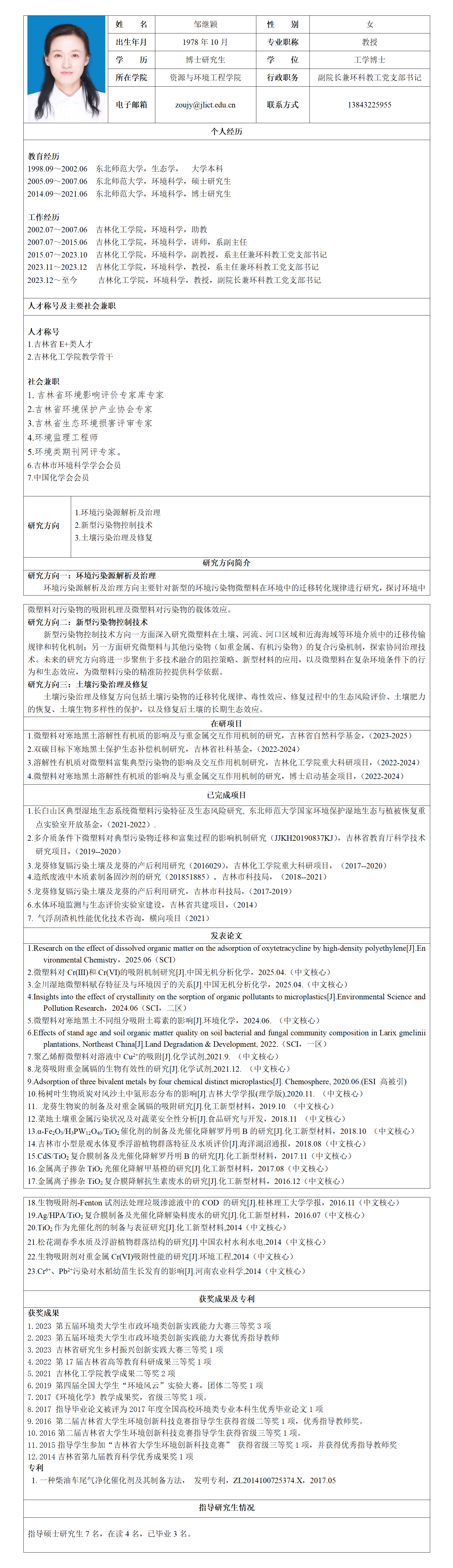 吉林化工大学硕士生导师个人情况简介-邹继颖
