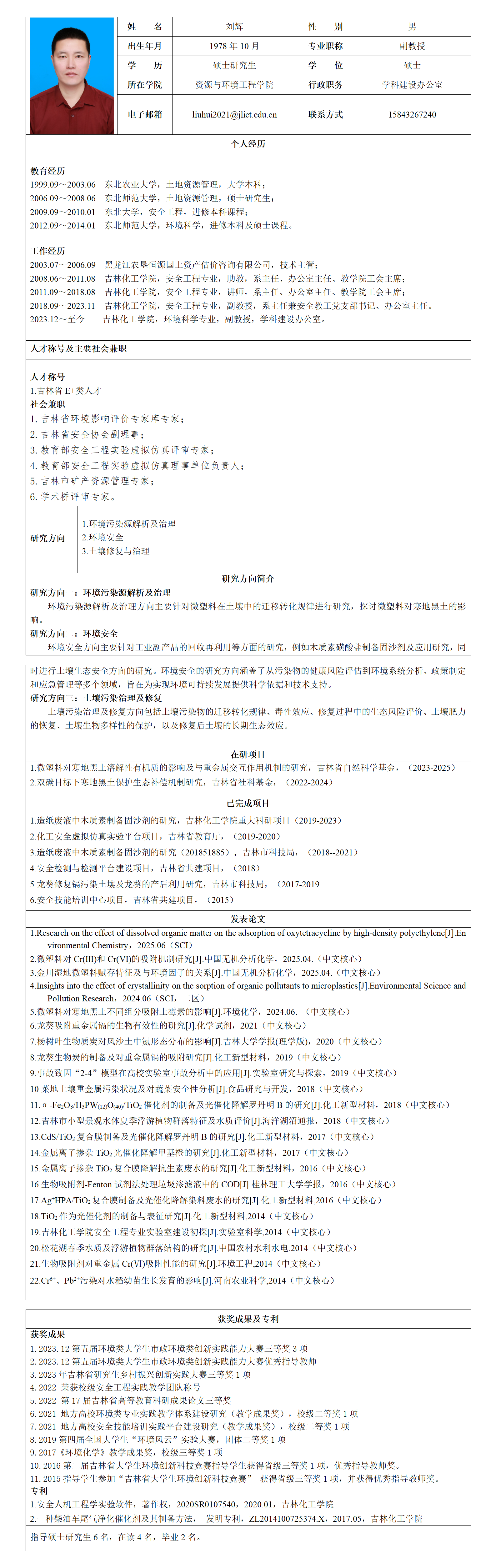 吉林化工大学硕士生导师个人情况简介-刘辉