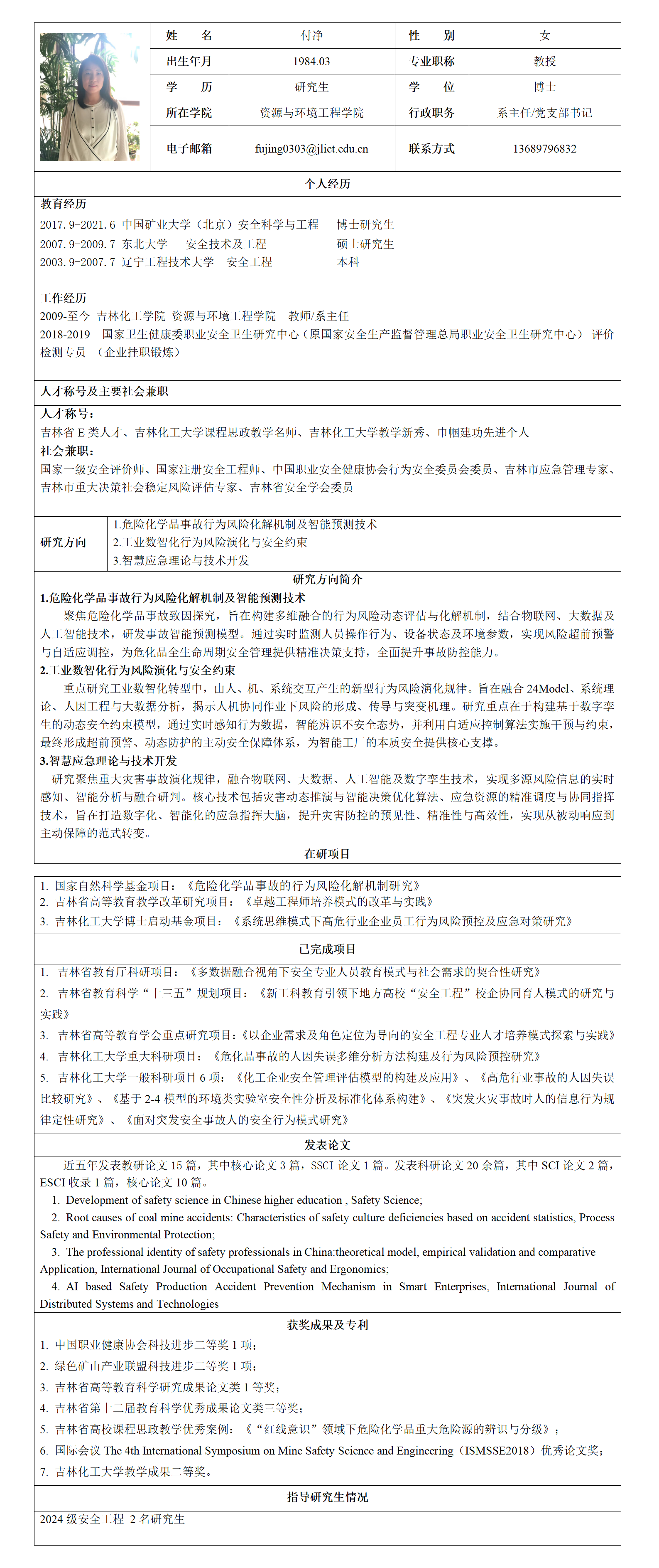吉林化工大学硕士生导师个人情况简介-付净